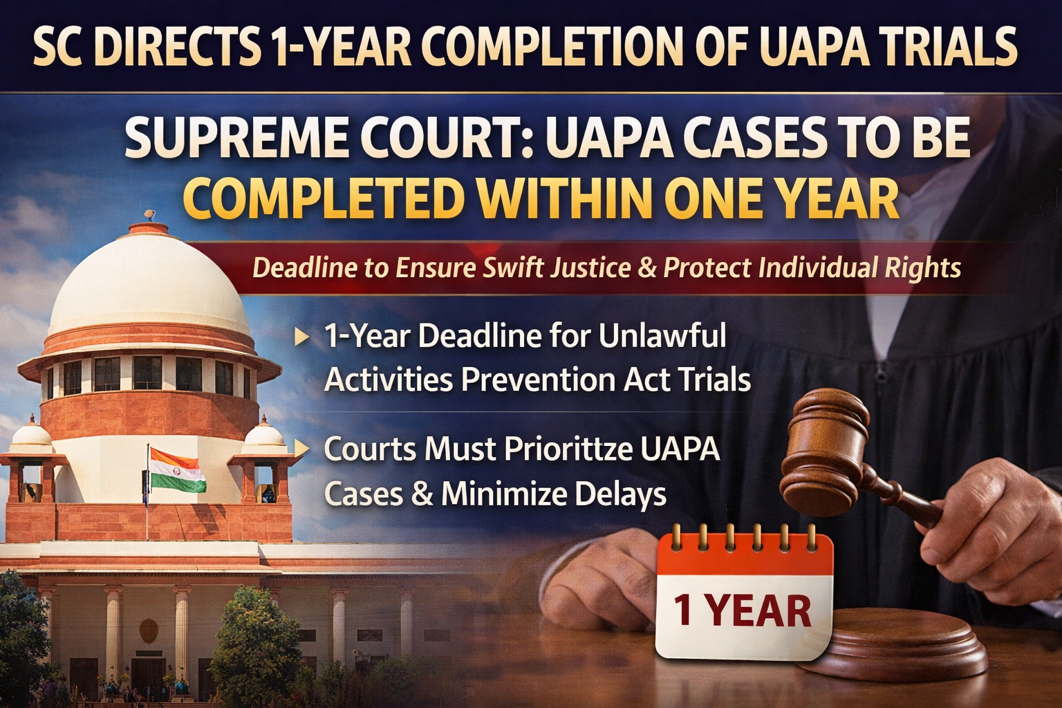 In a landmark decision aimed at ensuring swifter justice, the Supreme Court of India has directed that all trials under the Unlawful Activities (Prevention) Act (UAPA) must be completed within one year from the date of the charge sheet being filed. This ruling seeks to address long-standing concerns regarding delays in trials for cases involving … Read more