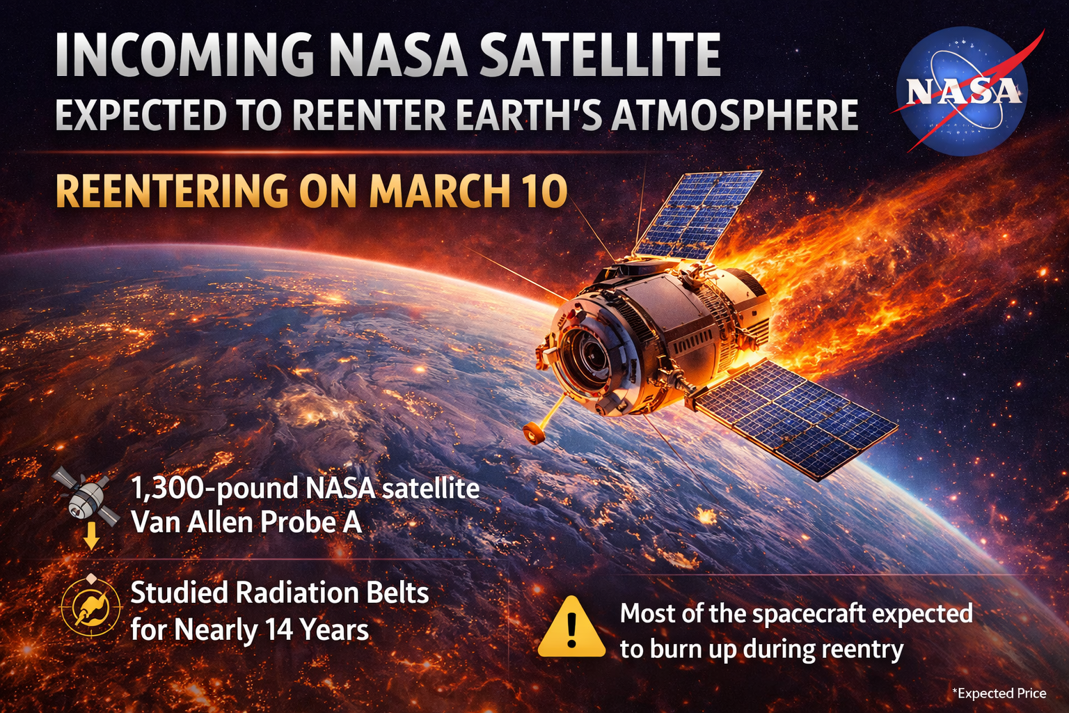 A retired NASA satellite weighing about 1,300 pounds is expected to reenter Earth’s atmosphere on March 10, drawing attention from scientists, space agencies, and the public. The spacecraft, known as Van Allen Probe A, has spent nearly fourteen years in orbit studying the radiation environment surrounding Earth. Its mission helped scientists better understand the dangerous zones of energetic particles that exist in space, known as the Van Allen radiation belts. After completing its primary mission and running out of fuel, the satellite’s orbit has gradually decayed over time. According to tracking data from the U.S. Space Force, the spacecraft is predicted to fall back into Earth’s atmosphere around 7:45 p.m. Eastern Time on March 10, although the exact timing could vary by several hours because orbital decay is difficult to predict precisely. Although the idea of a satellite crashing to Earth may sound alarming, scientists say the risk to people on the ground is extremely small. Most of the spacecraft will burn up in the atmosphere during reentry, with only small fragments potentially reaching the surface.